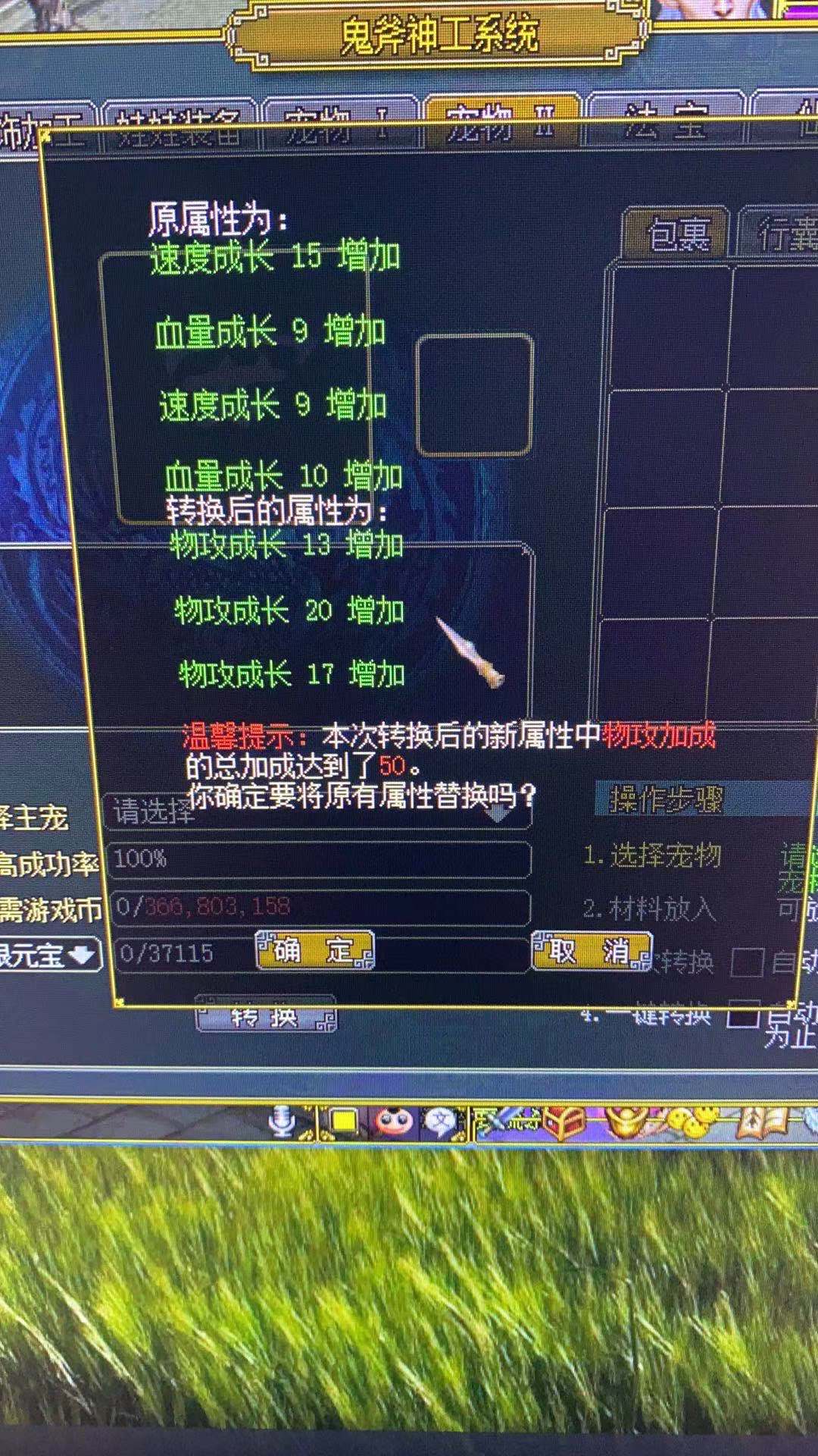 (附图)。我以为我眼睛花了,好好看了看下面还有温馨提示:本次转换后的新属性中物攻加成的总加成达到了50点。这不是假的。这是真的。又一次当托,这就好比给我这个假元灵飞升了一下物攻成长吧。哈哈