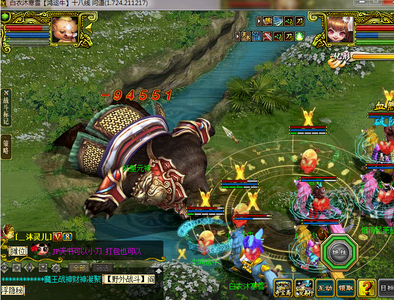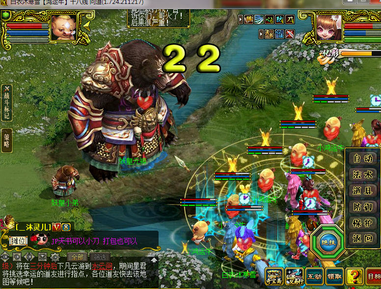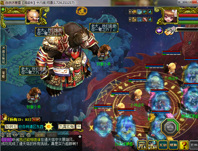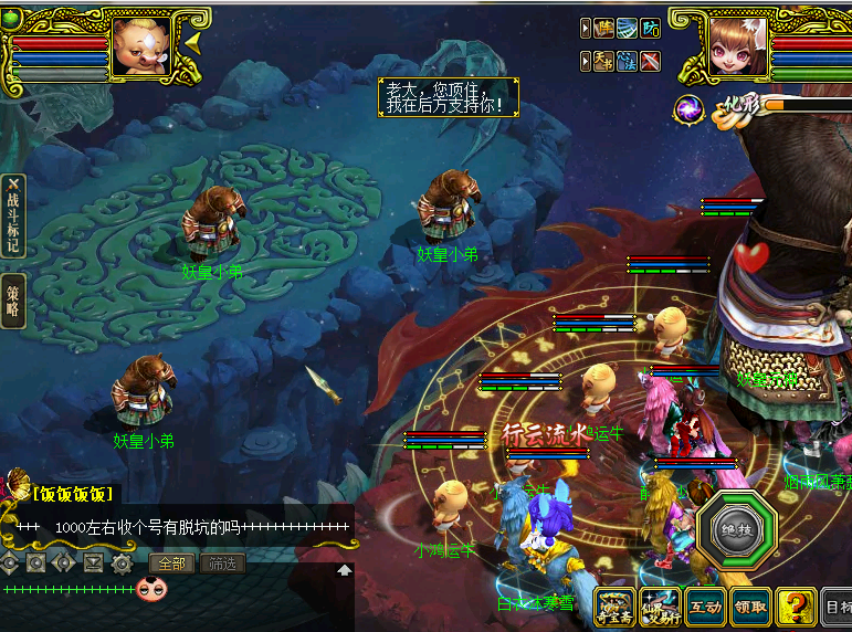 当然也有钉子户,这个小弟配合它们的老大,各种障碍小编,转眼打的黑熊妖皇都开始说话了,(注意:黑熊妖皇说话下回合速度最慢,小编感觉基本没速度了,我方输出完毕,它会憋一个大招,然后下回合会施展障碍法术)杀到黑熊说话那一轮记得水补防和金拉刀一个木号破,一个木拉蓝,一个木心,这一轮他不会攻击,但是至少保证宝宝的血量是满的,因为下一轮就是大秒,大秒之后就会障碍了,这个时候就全部点隐身,然后继续正常操作。黑熊妖皇的规律就是如此,熟练之后非常轻松。