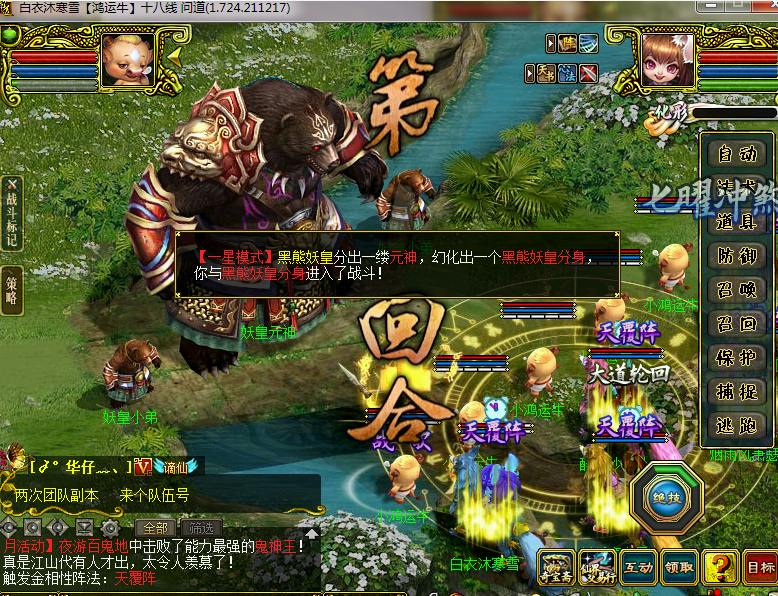 黑熊妖皇的混元金斗伤害依旧如此,一个斗子送走小编一个宠物,战斗日益艰难,但是小编队伍速度配合的好,人物都能尽到自己的作用。