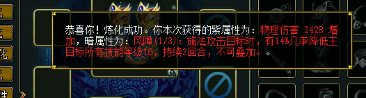 炼化成功后,可使装备拥有一条基于套装属性的明属性和一条成套生效的暗属性。