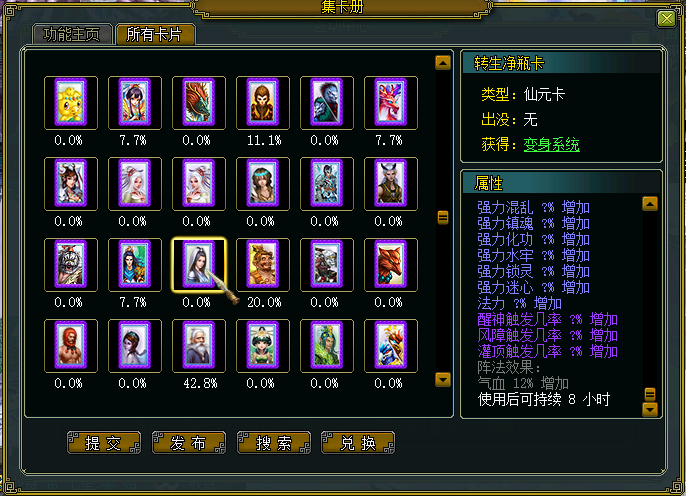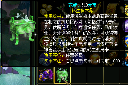 转生变身卡可带有紫属性,转生神兽卡1条,转生元灵卡2条,转生仙元卡3条。