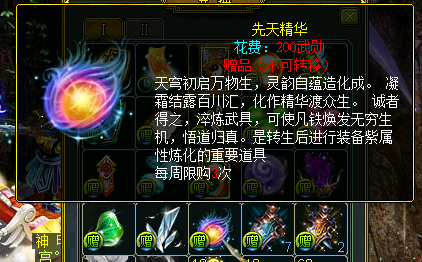 除了商城购买,先天精华还可以使用五脉积分兑换,200武勋/个,每周限购3次。