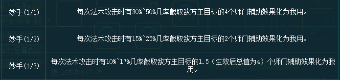 妙手(1/1):每次法术攻击时有30%~50%几率截取敌方主目标的4个师门辅助效果化为我用。