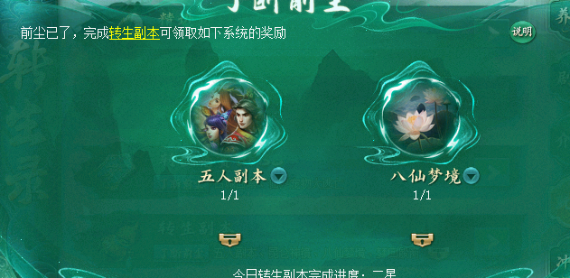 若完成的是转生副本有30%额外奖励加成,则领取的五人副本和昆仑神镜奖励也有30%加成。