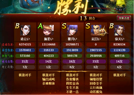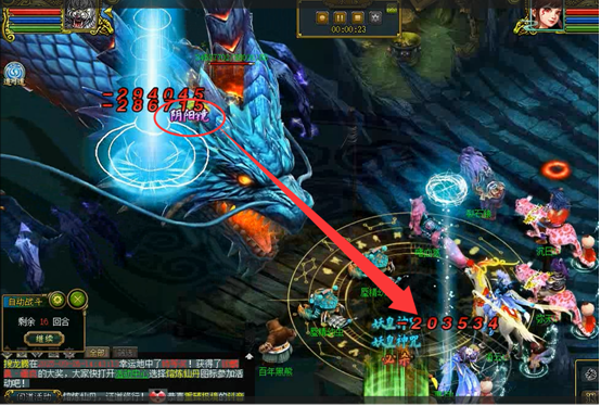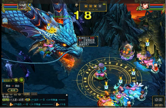 16、假如你运气不好,在这一回合没有收掉吞天也没有关系,吞天在释放完舍命再回血之后,我们依然先将吞天的血量磨到15%,然后等待娃娃隐身秘籍怒气攒够,再次全员后发(妖族可以等接近化形的那回合),下回合隐身出手。如此循环总有一回合是能收掉的,一般来说179门槛S的伤害是足够打149吞天的。