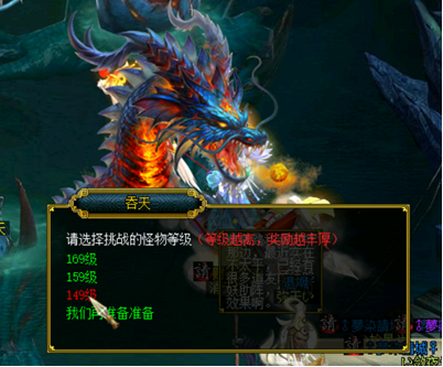 2、吞天有3个等级,道具奖励都是一样的,只是等级越高数值奖励越高,所以还是建议战力不足的玩家直接选最低的149级(拿道具碰6速运气才是核心)。
