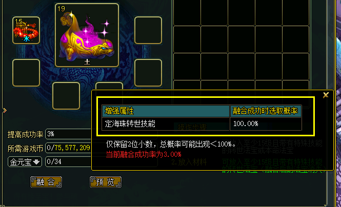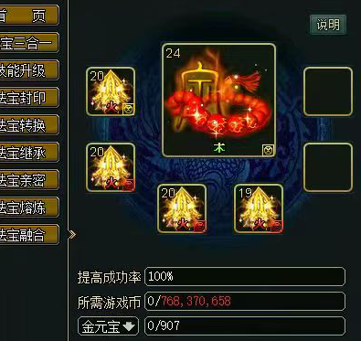 在融合界面可以看到一个成功率,副法宝的等级不同,成功率也不同,
