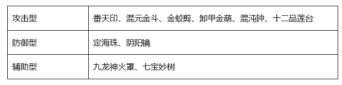 系统将法宝分为了三类,攻击型,防御性,辅助性。
