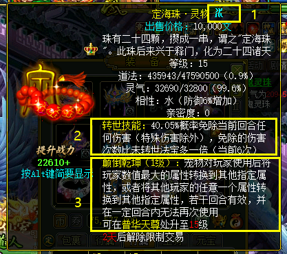 现在不仅拥有了金蛟剪的转世技能,同时也具备了定海珠免疫伤害的转世技能。