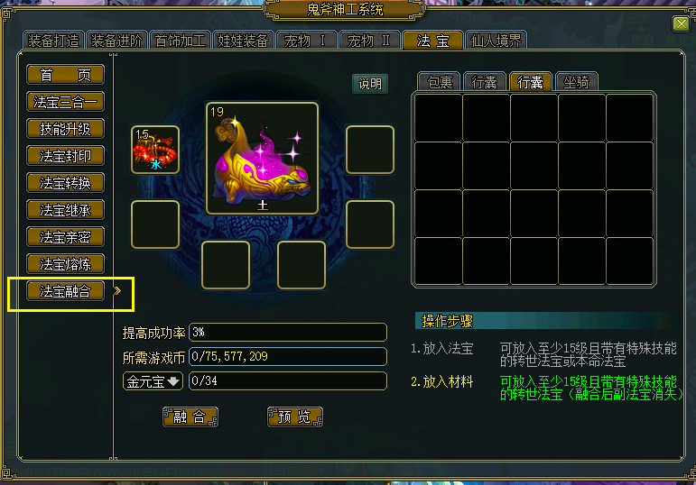 融合方式:准备一个主法宝,一个副法宝,打开鬼斧神工,选择法宝融合。
