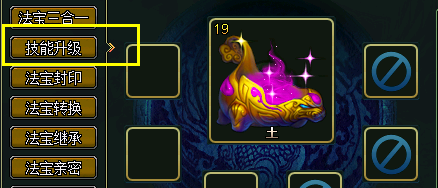 如果你想升级特殊技能,则优先升级第一个技能,当技能等级与法宝等级持平后,自动提升第二特殊技能等级。